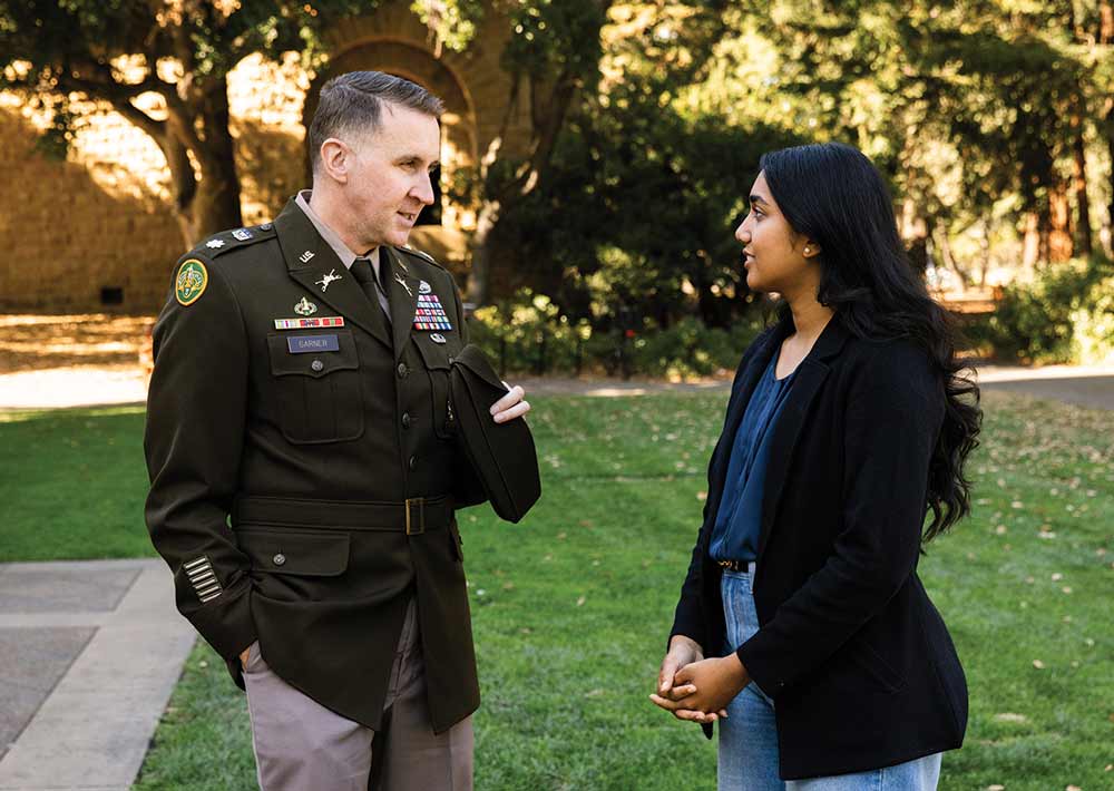 National Security Affairs Fellow Lt. Col. Thomas N. Garner and his mentee Anika Yadav (’28) speak outside Hoover Tower on the Stanford campus on November 8, 2024.
