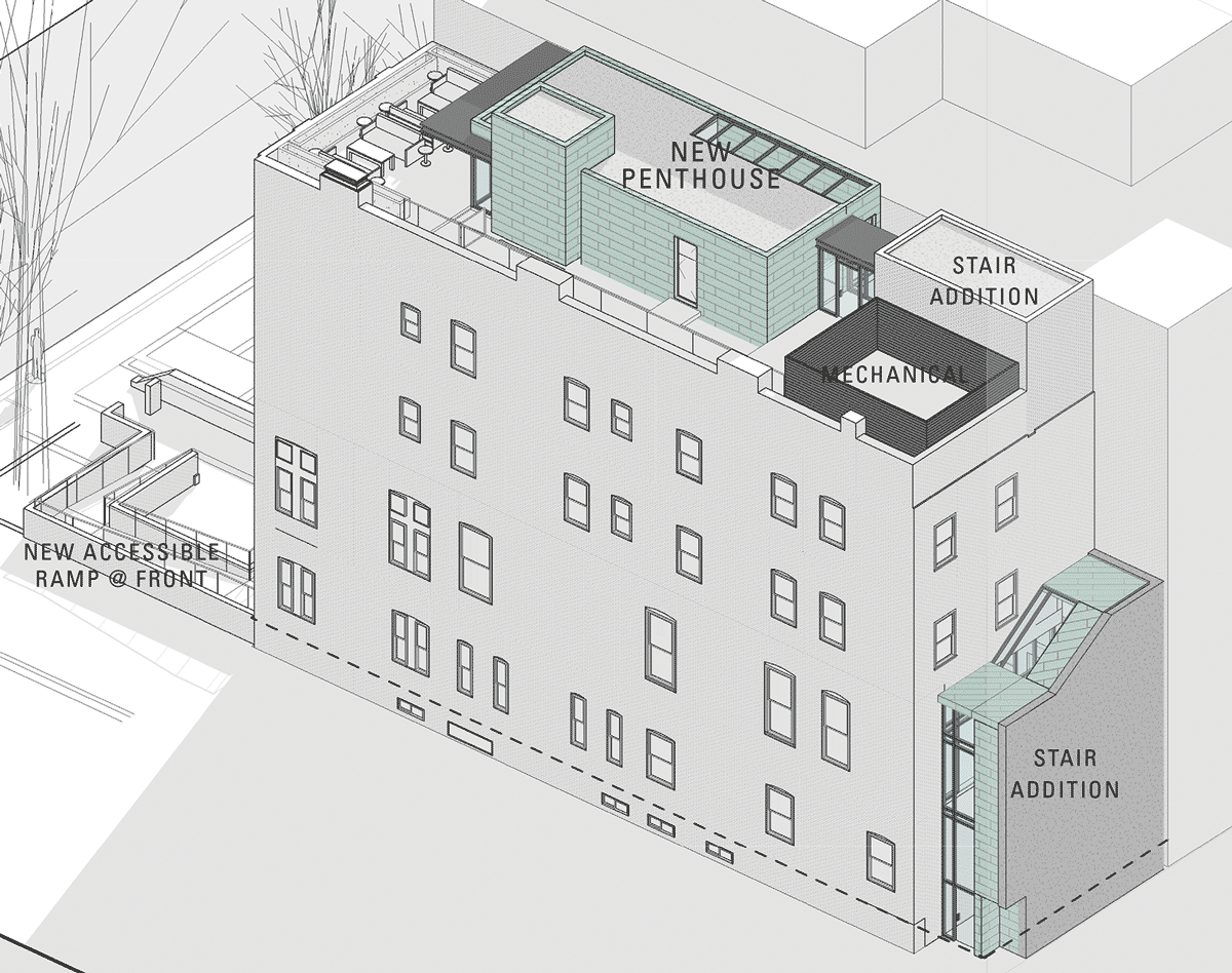 A schematic design for the new Hoover Institution’s Washington, DC, headquarters, with new additions to the building shown in light green.