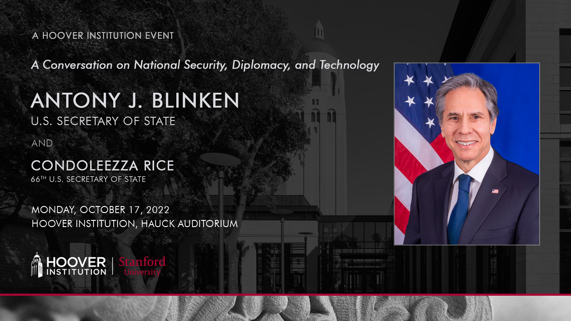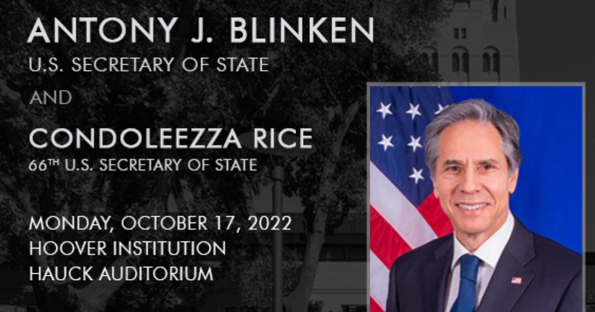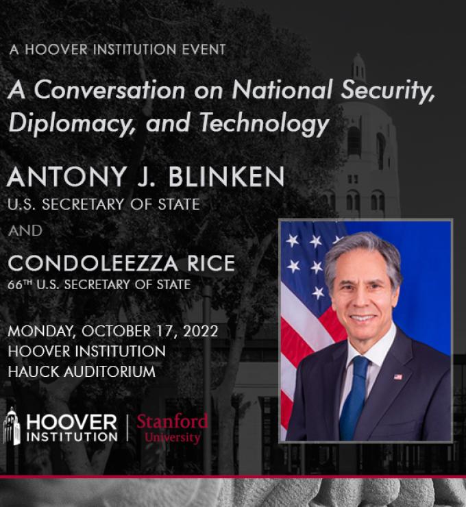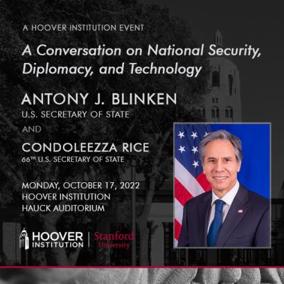 The Hoover Institution hosts a conversation on National Security, Diplomacy, and Technology between Secretary of State Antony J. Blinken, 71st U.S. Secretary of State, and Condoleezza Rice on Monday, October 17 at 10:45 a.m. PT.