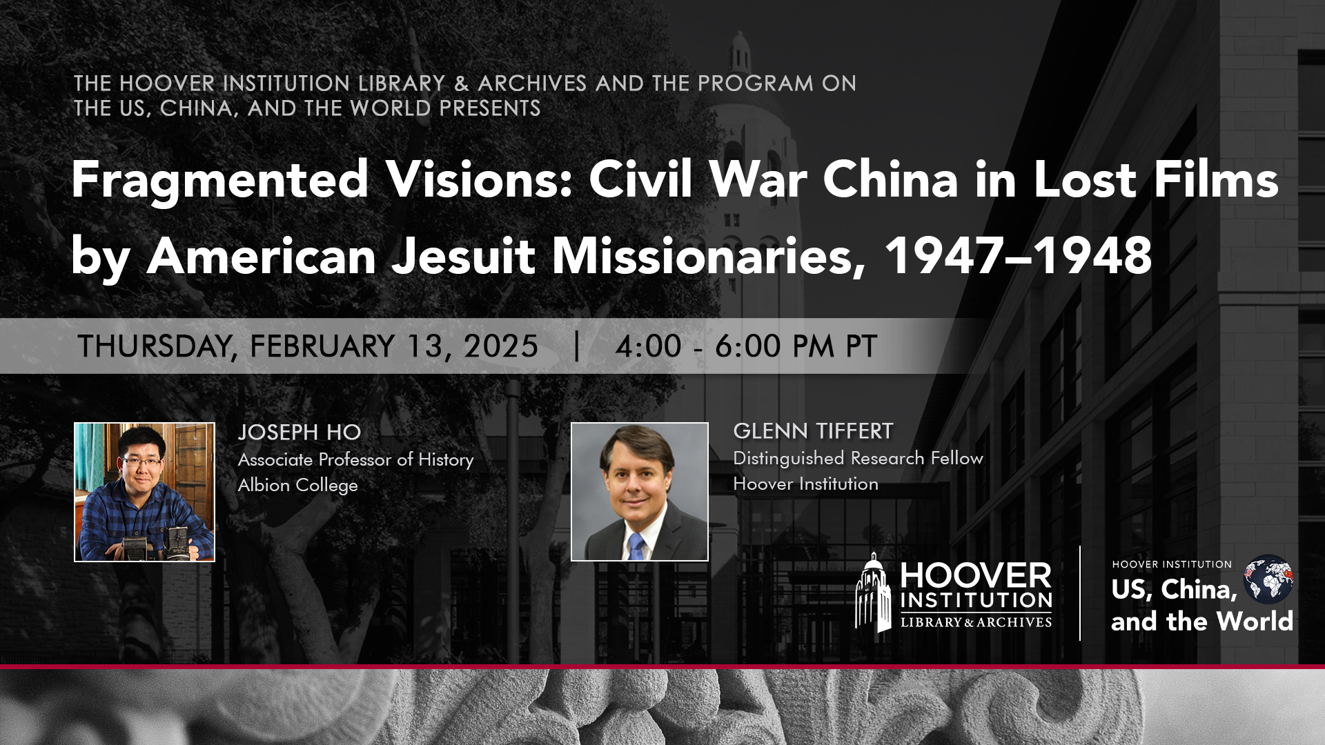 The Hoover Institution Library & Archives and the Program on the US, China, and the World invite you to a film screening Fragmented Visions: Civil War China in Lost Films by American Jesuit Missionaries, 1947–1948 on Thursday, February 13, 2025 from 4:00pm - 6:00pm PT.