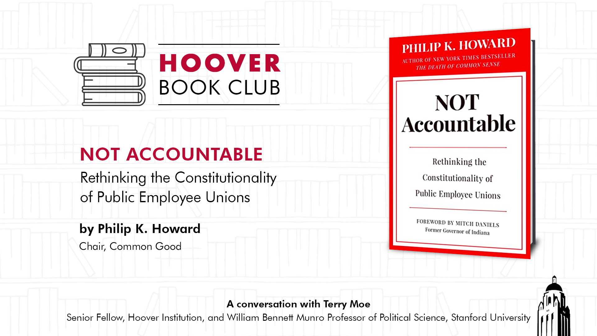 In our latest installment, watch a discussion between Terry Moe, a senior fellow at the Hoover Institution and the William Bennett Munro Professor of political science at Stanford University, and Philip K. Howard, author of Not Accountable: Rethinking the Constitutionality of Public Employee Unions on Tuesday, March 28, 2023 at 10:00 am PT/ 1:00pm ET.