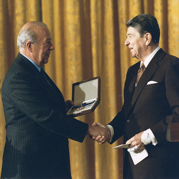 Ronald Reagan presents George P. Shultz with the Presidential Medal of Freedom