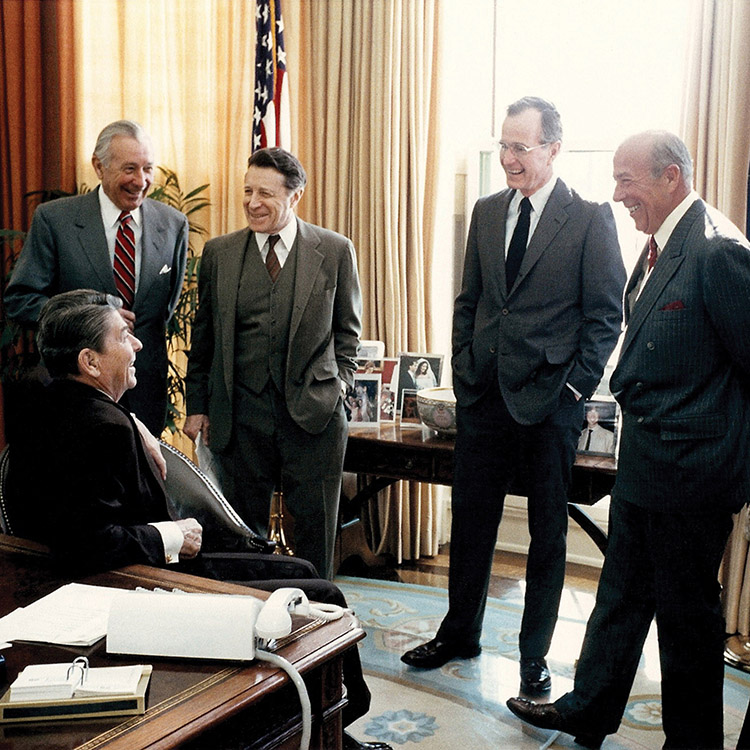 Ronald Reagan, George H.W. Bush and George P. Shultz in the Oval Office