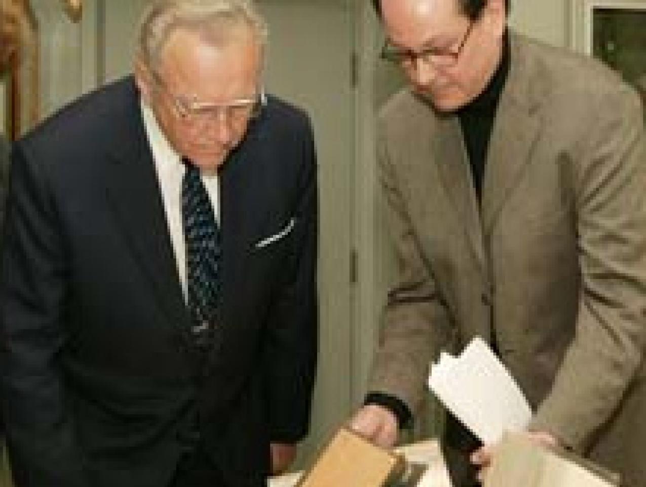 Before delivering a policy address at Stanford University's Freeman Spogli Institute for International Studies on January 20, 2006, His Excellency Arnold Rüütel, president of Estonia, visited the Hoover Institution. Hoover staff members David Jacobs and Linda Bernard presented some of the historical materials relating to Estonia held by the Library and Archives.