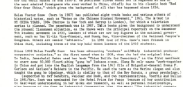 The materials contain Nym Wales’s 1989 unpublished manuscript, in which she gave penetrating insights into the occurrences in Tiananmen Square on June 4, 1989, Chinese-American relations, globalism, a reflection on her eighty-second birthday in 1989, as well as her correspondence with Communist Chinese provincial organizations and friends within and outside the United States in the late 1980s and the early 1990s.