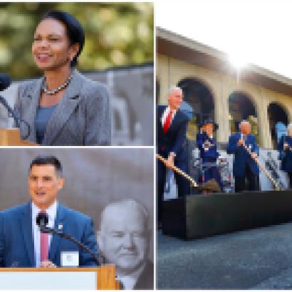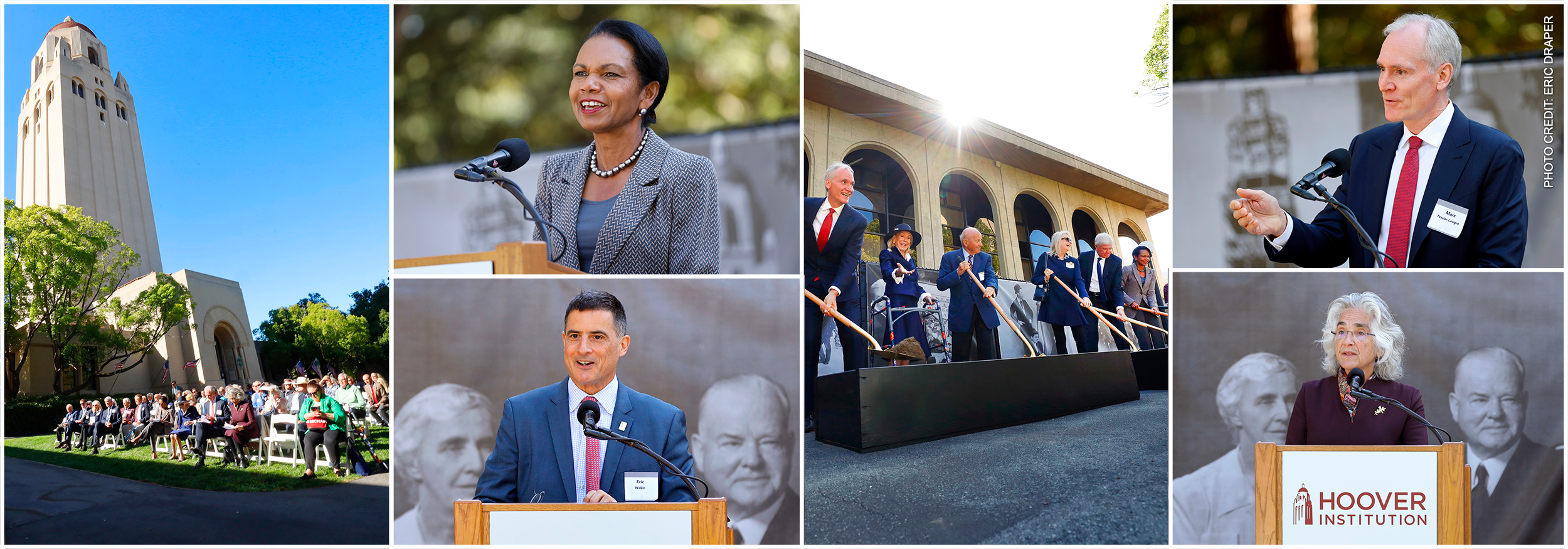Talking to a crowd of supporters, fellows, and members of the Shultz family in front of the Hoover Tower, leaders from Stanford University and the Hoover Institution paid tribute to the remarkable life of America’s sixtieth secretary of state and explained how the building, once completed, will be a fitting monument not only to his legacy as an American statesman but also to his extraordinary ability to convene scholars and policy leaders to share and conceptualize big ideas.