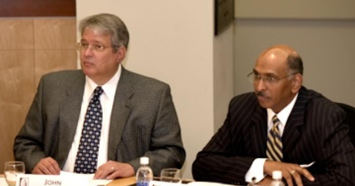 Michael Steele, the Republican National Committee chairman, met with Hoover fellows on Tuesday, January 12, as the guest of honor at a roundtable discussion followed by a lunch. Topics discussed at the roundtable included terrorism and national security, the economy, and health care reform. Steele (right) is pictured with John Raisian, the Tad and Dianne Taube Director of the Hoover Institution. See related story.
