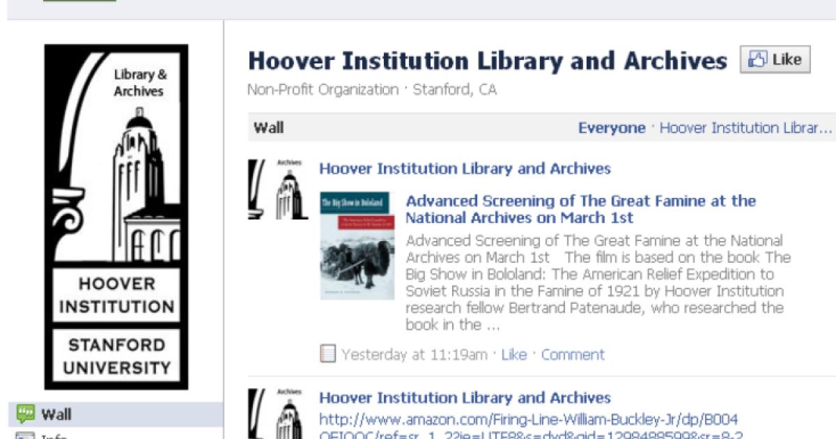 The Hoover Institution Library and Archives launched its Facebook page. The page informs Facebook friends of events at the library and archives; recent acquisitions; information on publications and documentaries; news reports based on the library and archives collections; news related to the library and archives; and about access to the collections.