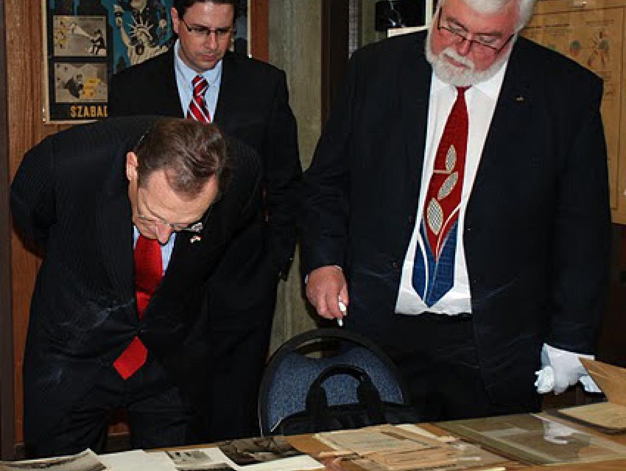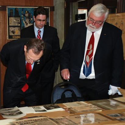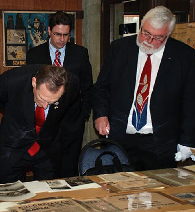 Hungarian ambassador to the United States György Szapáry, along with Eva Voisin, the honorary consul general of Hungary in San Francisco, and Gabor Kaleta from the consulate in Los Angeles, met with Richard Sousa, the director of the library and archives at the Hoover Institution on April 26, 2011. After the meeting, Maciej Siekierski, curator of Hoover’s East European Collection, gave the ambassador a tour of the Hoover Archives, focusing on the Hungarian collections, including publications from the time of the Paris Peace Conference of 1919, photographs of the American Relief Administration at work in Budapest during 1919–21, the manuscript of the autobiography of Admiral Miklos Horthy (regent of the Kingdom of Hungary during the interwar years), posters from the 1989–90 peaceful political revolution, and the Imre Pozsgay papers, as well as selected items from the papers of Hoover fellows Edward Teller, Friedrich von Hayek, and Milton Friedman. To the ambassador’s pleasure, some material displayed for him included early twentieth-century photographs of and letters to and from his relatives, none of which he had seen or was aware existed. Ambassador Szapáry is an economist by training with extensive experience in international finance and banking. He spent much of his career at the International Monetary Fund in Washington, DC. His grandfather was Hungarian prime minister at the end of the nineteenth century.