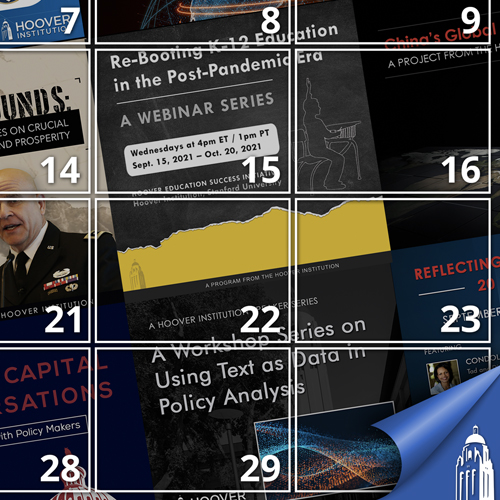 In 2021, the Hoover Institution continued to follow the COVID-19 protocols while hosting virtual events and safely returning to our in-person events in the fall. In the programs listed, Hoover fellows discussed a range of topics and issues, including educational challenges, foreign policy, cybersecurity, economics, and US policies.