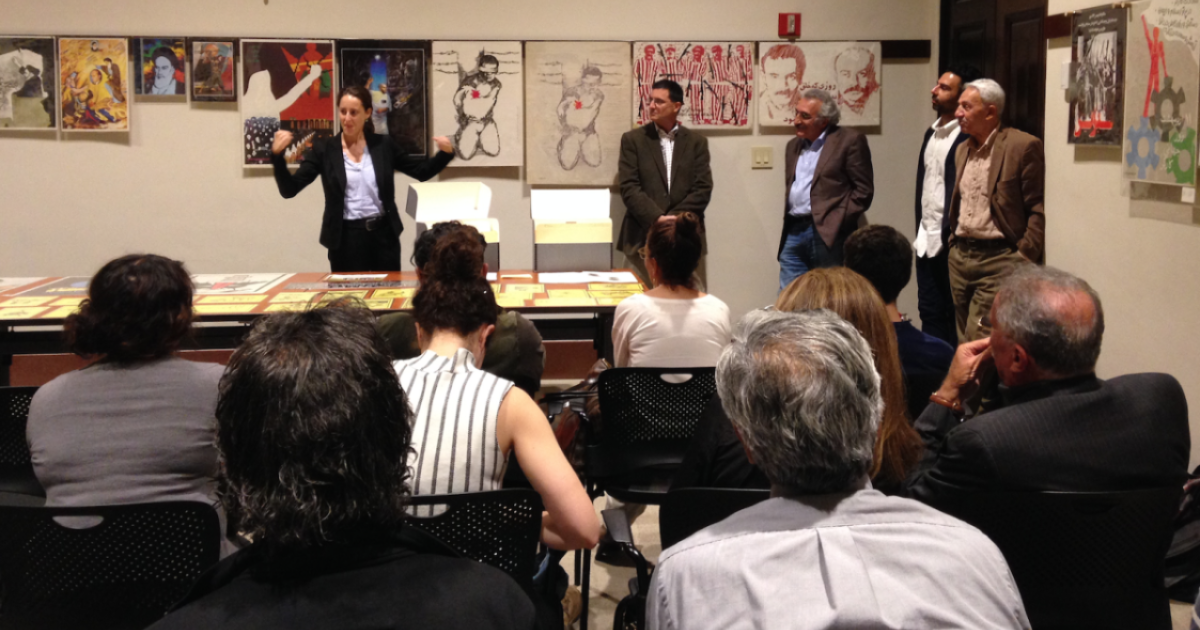 On November 4, participants from the series Art, Social Space and Public Discourse in Iran visited Hoover Archives to view posters and graphic material from the Iranian Revolution and Iran-Iraq War. Art, Social Space and Public Discourse in Iran is the first chapter of a symposium series on Iranian art that aims to bring together an interdisciplinary array of critical conversations, on-site practices, and collaborative art projects in order to reassess and redefine art in the context of public space. This unprecedented three-year initiative on Iranian art, co-sponsored by Stanford’s department of Iranian Studies, Stanford Global Studies, the Institute for Diversity in the Arts, and Stanford’s Center for Comparative Studies in Race and Ethnicity, investigates the multiple contexts that shift and define changing ideas of what constitutes Iranian public space. Visitors to Hoover not only viewed rare materials from Hoover’s collections, but enjoyed remarks by Hoover fellow and the director of Stanford’s Hamid and Christina Moghadam Program in Iranian Studies, Abbas Milani. Milani was joined by Eric Wakin, director of Hoover Library & Archives, professor and book arts expert Christiane Gruber, Nasser Rahmaninejad, an artist and former political prisoner in Iran, and organizer Ala Ebtekar, visual artist and a lecturer at the Institute for Diversity in the Arts at Stanford.