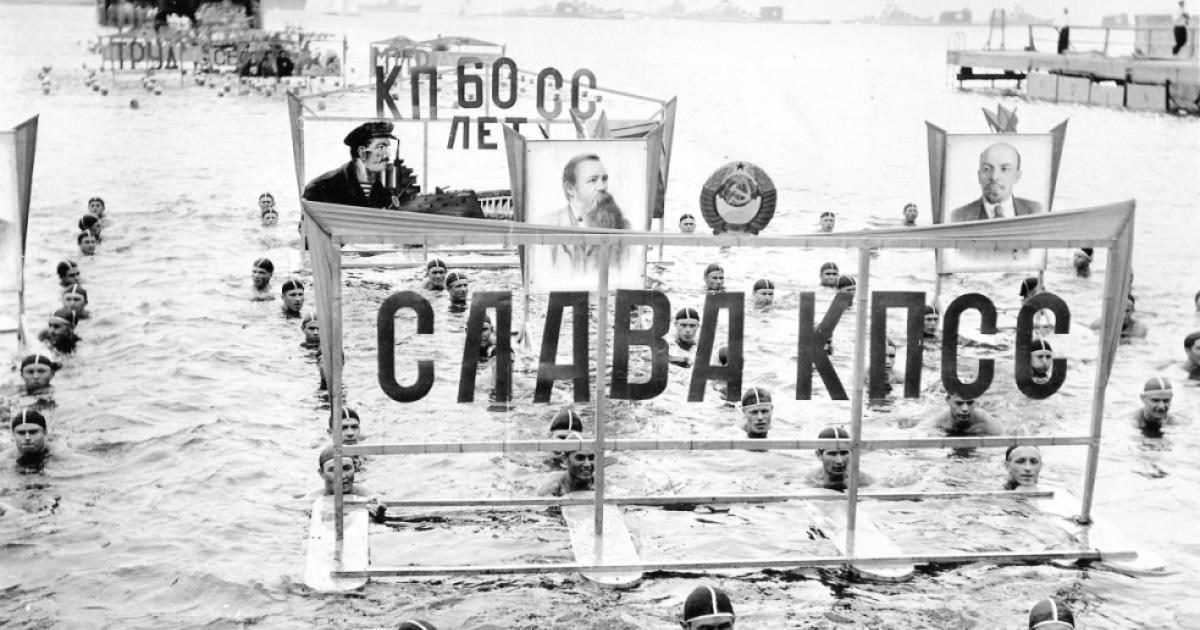 In 1963 the Soviet Union observed the sixtieth anniversary of the Russian Communist Party with various central and local festivities and parades. The Soviet Pacific fleet organized a parade as well, herding hundreds of sailors off amphibious warfare ships into the icy waters of Vladivostok harbor to honor Lenin and the other patron saints of Russian and international communism in a so-called synchronized swimming parade documented in one of the photos.