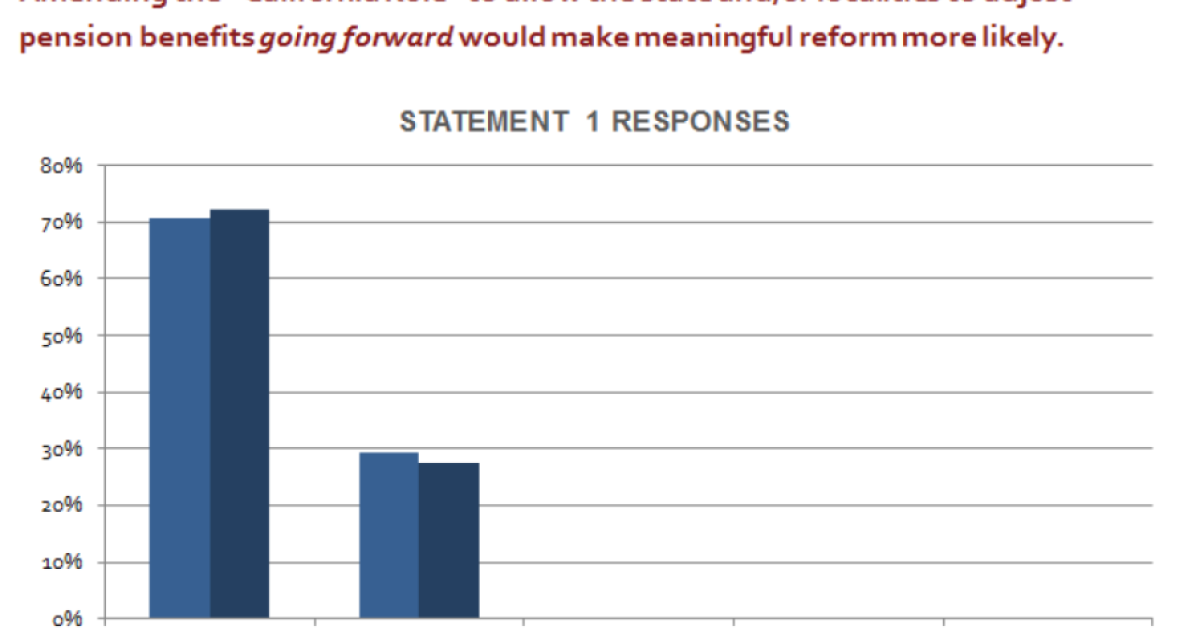 The Post-Conference Report presents the results of the survey, providing a graphic for each statement showcasing the raw and confidence-weighted responses. Accompanying each graphic is a short summary providing details on the topic addressed in each statement. Some key findings include wide consensus that for reform to occur, the “California Rule” (the statutes that outlaw detrimentally changing pension benefits for current employees) needs amending; wide disagreement that small reforms—like eliminating "spiking" and "double-dipping"—would solve pension challenges; and strong agreement that San Jose’s recent pension reform is the best example for other California cities and localities to follow.