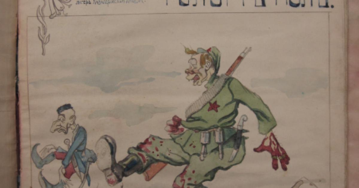 As curator, I have seen some spectacular collections come into the Hoover Archives. But only Petrie’s words could relay my feelings when I opened a newly delivered box that had arrived in the mail containing the slender bound volume containing several issues of Razviei gore v golom polie. Handwritten periodicals, each issue of which was produced in single copy for circulation among the officers and soldiers of General Petr Vrangel’s army, interned on the Gallipoli Peninsula in 1920–21, have been known to historians for some time. But this knowledge came to us from memoirs and contemporary accounts of life in the camp; very few issues had actually survived. So receiving this set of issues of Razviei gore v golom polie was indeed the equivalent of discovering a treasure that had been thought to have been lost to history and scholarship forever. The drawings, caricatures, poems, political satire, and other materials in this journal are bound to thrill researchers for many years to come. The content is varied, from short stories to historical sketches and analyses of current events, as well as humorous sketches of daily life in the camp and some of its more colorful personalities. The name of the journal is itself a pun. “Gallipoli” to the Russian ear sounds a bit like “goloe polie” or “empty field,” which is exactly what it looked like to the units of the White Army interned there. The title as a whole could be translated as “Lose Your Grief in an Open Field” referring to the lighthearted nature of the journal.