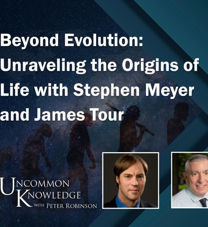 Peter Robinson: Two questions, how do higher forms of life evolve from lower forms of life? Charles Darwin answered that question, or at least thought he did. But the other question is one that Darwin never even attempted to answer. Where does life come from in the first place? Scientist and philosopher Stephen Meyer and chemist James Tour, Uncommon Knowledge now.