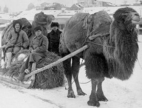 Their place was taken by great furry camels, exotic beasts of burden in the Russian heartland. All the testimony about their unruly individualism would appear to render oxymoronic the notion of a camel caravan, but in fact this was, and remains, the singular romantic image of the corn campaign, indeed of the entire American relief mission, appearing in numerous letters and reports from relief workers and preserved on film. Most impressive are camel-and-sleigh transport columns extending out of sight into the snowy expanse of the steppe.