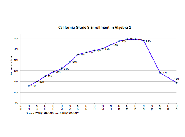 Before the push for Algebra I in eighth grade that came with implementing the 1997 California standards, taking algebra early was the privilege of the few and of the affluent. To put it one way, eighty-four percent of the 1999 cohort of eighth graders in California performed “far below basic” on Algebra I because they simply never had a chance to take it. But then things began to change.