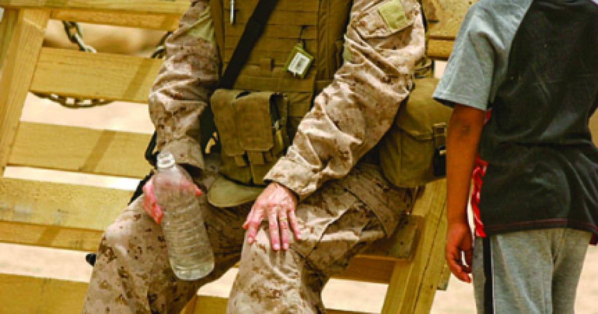 Brenda Dwiggins, a chaplain’s assistant assigned to the 1st Marine Logistics Group who serves on a special Iraqi Women’s Engagement (IWE) team, greets a boy in Anbar province. Such teams were set up to provide security and medical care for Iraqi women, who are discouraged from interacting with men in public.