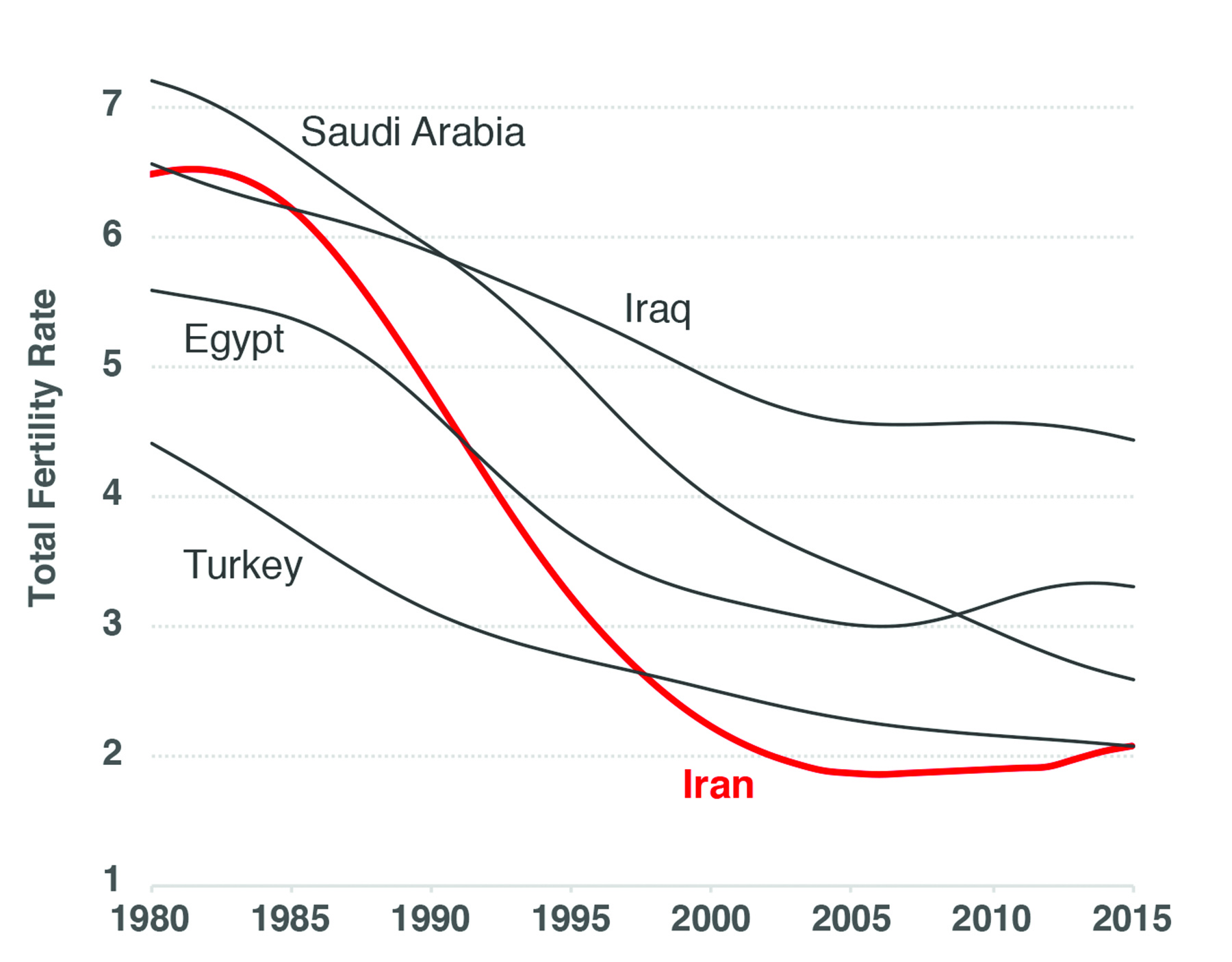 Figure 2. Dramatic drop in the total fertility rates of Iran and comparison with some other countries in the Middle East (1980–2015)