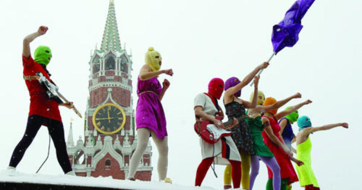 A masked guerrilla theater group performs in January in Red Square, perched atop a rampart once used for announcing czars’ decrees and carrying out public executions. The eight were later detained after their anti-Putin protest and accused of violating public order.