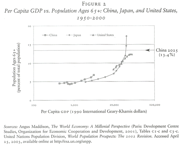 Between 2000 and 2025 China’s median age is set to rise very substantially: from about 30 to around 39. According to unpd projections for 2025, in fact, China’s median age will be higher than America’s. The impending tempo of population aging in China is very nearly as rapid as anything history has yet seen. It will be far faster than what was recorded in the more developed regions over the past three decades and is exceeded only by Japan. There is a crucial difference, however, between Japan’s recent past and China’s prospective future. To put the matter bluntly, Japan became rich before it became old; China will do things the other way around. When Japan had the same proportion of population 65 and older as does China today (2000), its level of per capita output was three times higher than China’s is now. In 2025, 13.4 percent of China’s population is projected to be 65-plus; when Japan crossed the 13.4 percent threshold, its per capita gdp was approaching $20,000 a year (constant 1990 ppp dollars). One need not be a “Sino-pessimist” to suggest that China will be nowhere near that same economic marker 22 years from now.