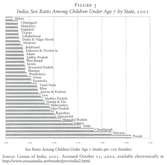 China will be the first great power in Asia to suffer from a twenty-first century “bride shortage,” but it may not be the last. Unsettling trends of a similar nature are already evident in India.18 Son preference in India remains extremely strong; according to national survey results, women venturing a preference for their next birth voted for boys over girls by a ratio of four to one. With declining fertility and the spread of ultrasound, India’s sex ratio is already on the rise. In the 2001 census, India counted almost 108 boys under age 6 for every 100 girls. In Uttar Pradesh, India’s most populous state, that ratio was over 110; in Delhi, it was over 115; and in Punjab it was reportedly 126.19