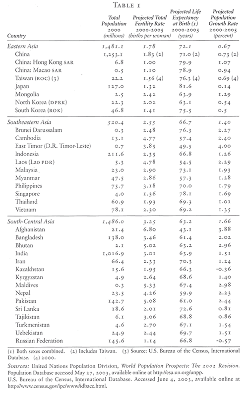 Over the past half-century, the population of this region has grown on a scale and at a tempo without historical precedent. Between 1950 and 2000, according to the unpd’s estimates, the population of the collectivity of countries in Table 1 (see next page) multiplied by a factor of 2.5 — rising by almost 2.2 billion in absolute numbers and at an average annual pace of over 1.8 percent per year. Perhaps not surprisingly, this extraordinary Asian “population explosion” captured the attention and aroused the foreboding of commentators, scholars, and policymakers around the world. (A small library of literature was generated over the course of two generations on the purported economic, political, and strategic implications of this vast population shift.) The vision of unrelenting and unprecedented increases in human numbers in Asia continues to inform much popular and policy discussion — thanks in no small part to official alarms regularly sounded by institutions and programs established over the past few decades with the express purpose of slowing population growth.